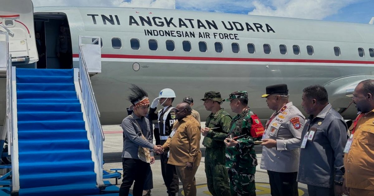 Teras News — Senin pagi, Wakil Presiden Gibran Rakabuming Raka menginjakkan kaki di Bandara Douw Aturure, Nabire, Papua Tengah — membuka serangkaian kunjungan kerja di Tanah Papua dengan memakai mahkota kasuari dan tas selempang noken khas Papua yang disematkan saat ia tiba.